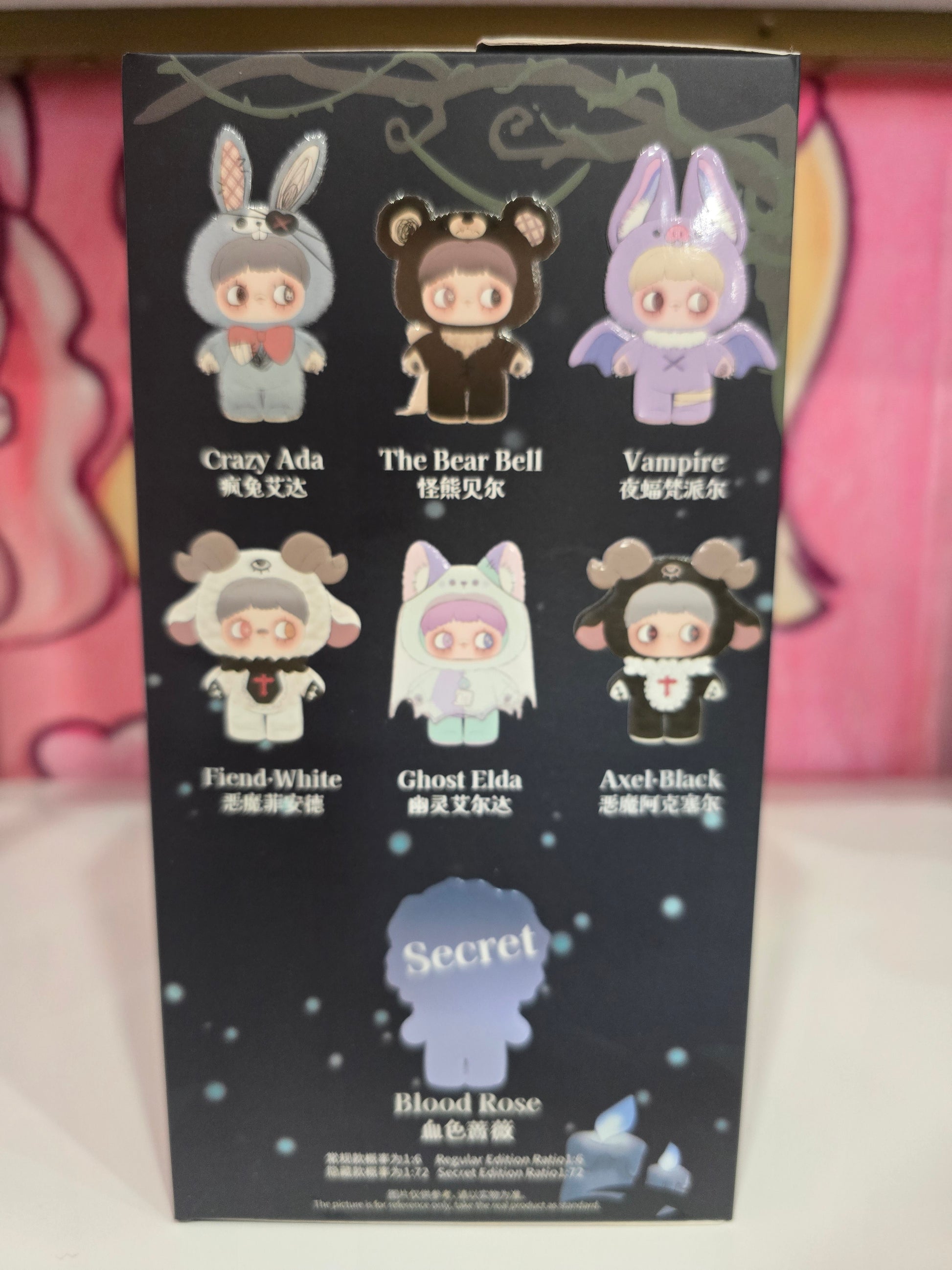 The Maymei Dark Forest series is a collection of plush blind box toys with a whimsical and spooky "dark forest" theme, featuring characters like a vampire bat, a demonic sheep, a ghost cat, and a dreamy bunny. The set has a Halloween-like vibe with characters embodying spooky and mysterious themes, such as an "Axel Black" demon sheep and a "Ghost Elda" luminous cat.