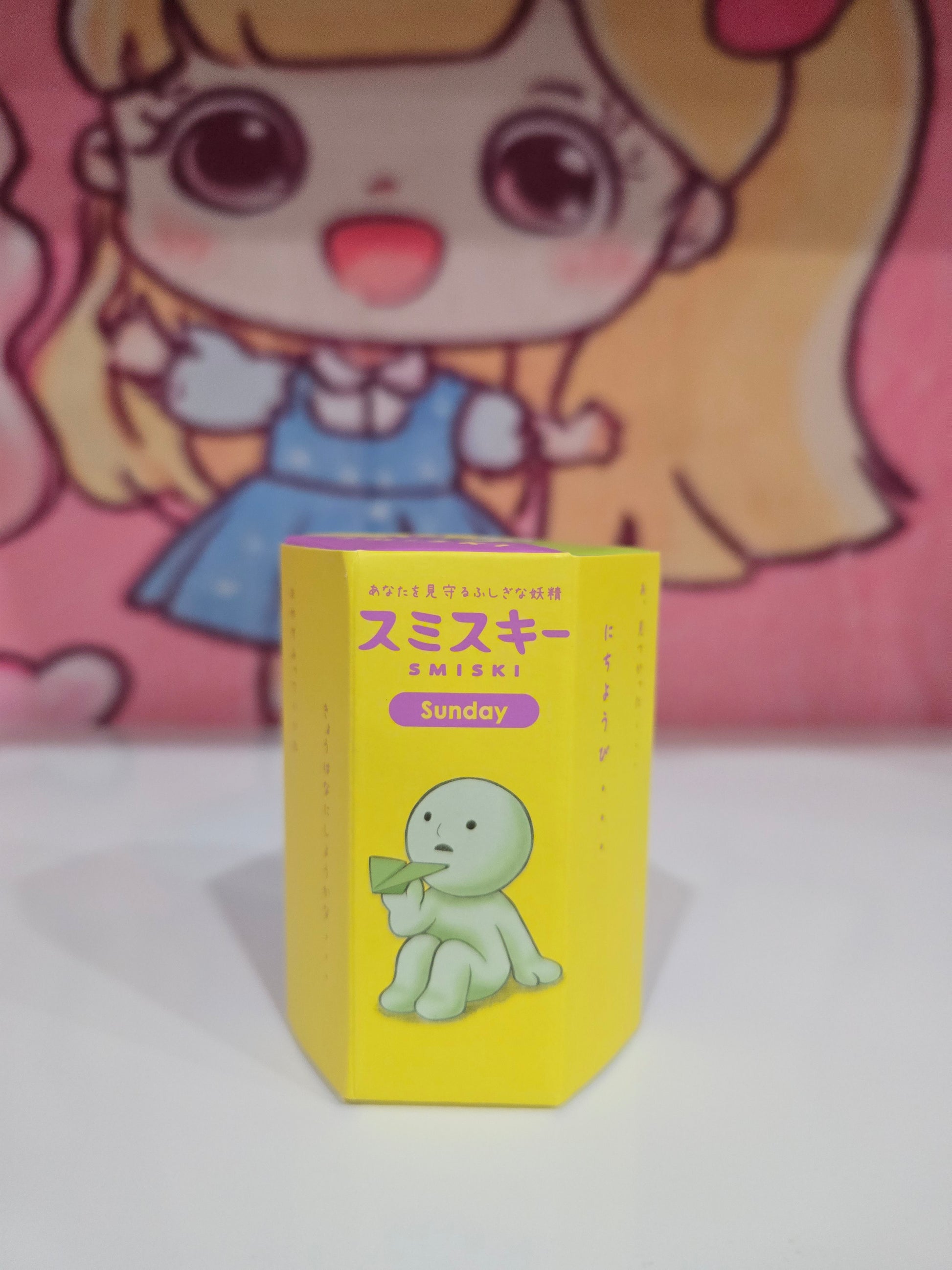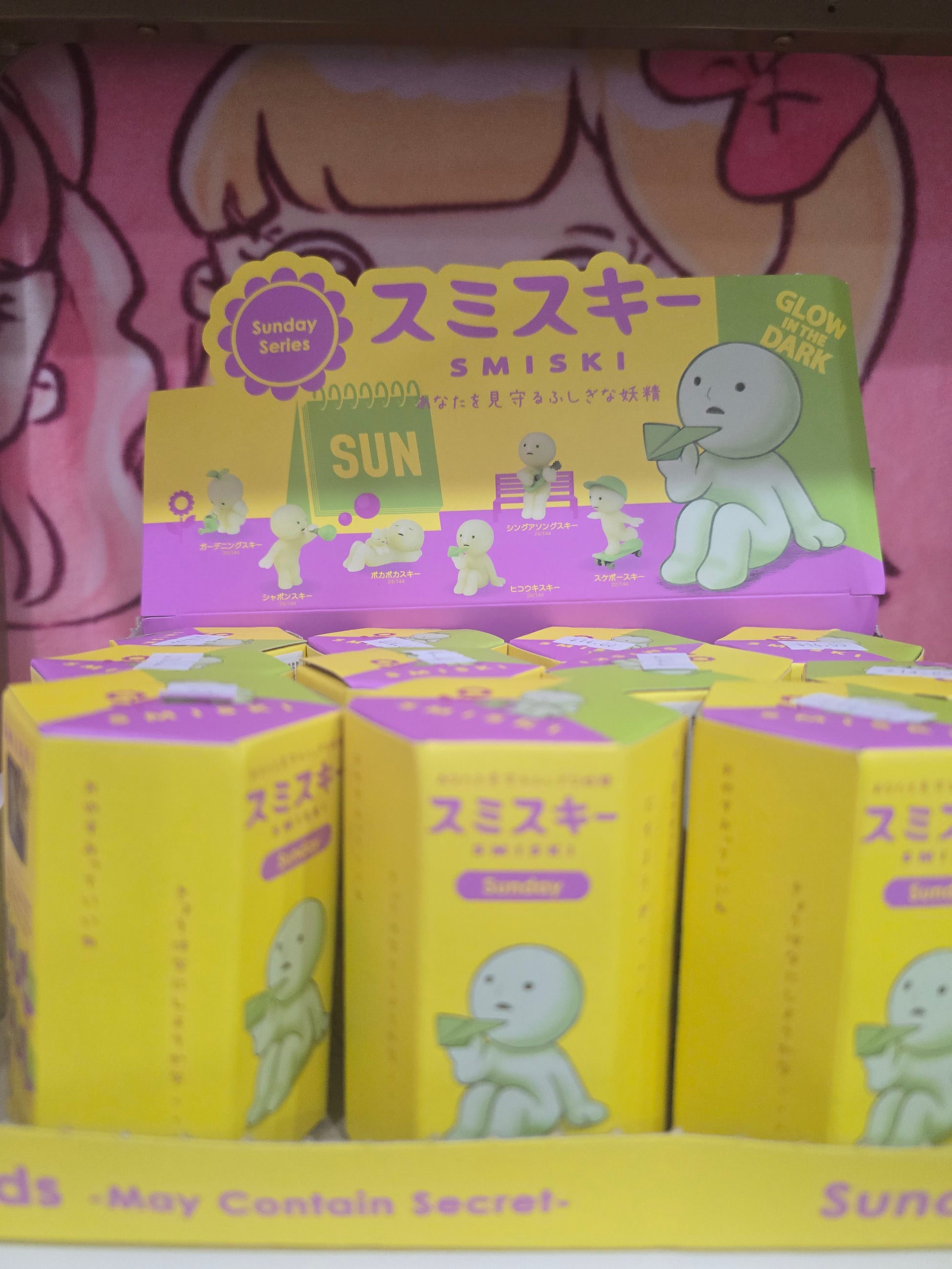 The Smiski Sunday Series features Smiski figures enjoying a relaxing Sunday with activities like singing, sunbathing, skateboarding, gardening, and blowing bubbles. Like other Smiski series, these are sold as blind boxes, meaning each package contains one of six possible regular figures plus a rare secret one, determined randomly. The figures are made of a special phosphorescent material that allows them to glow in the dark.